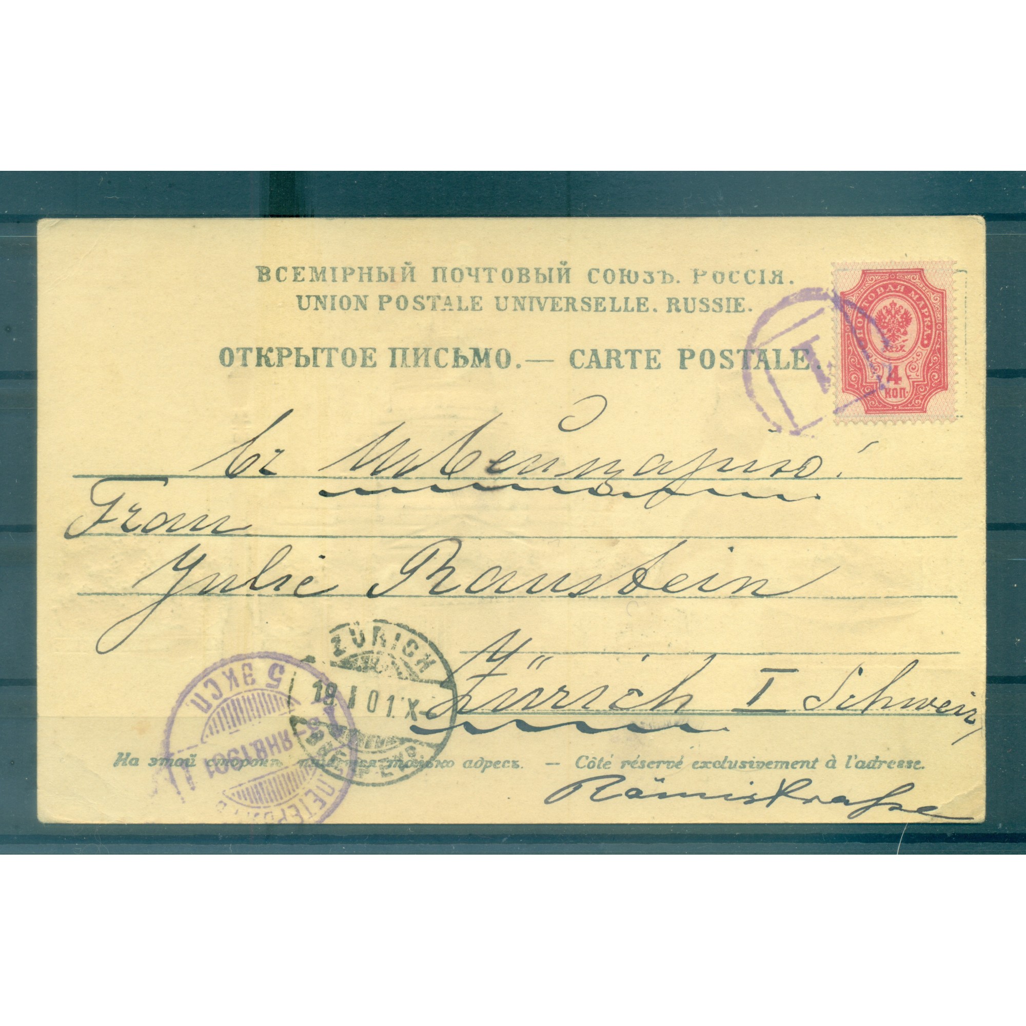 Russia - Postcard sent to Zurich (Switzerland) from Saint Petersburg (Russia) on january 3, 1901.