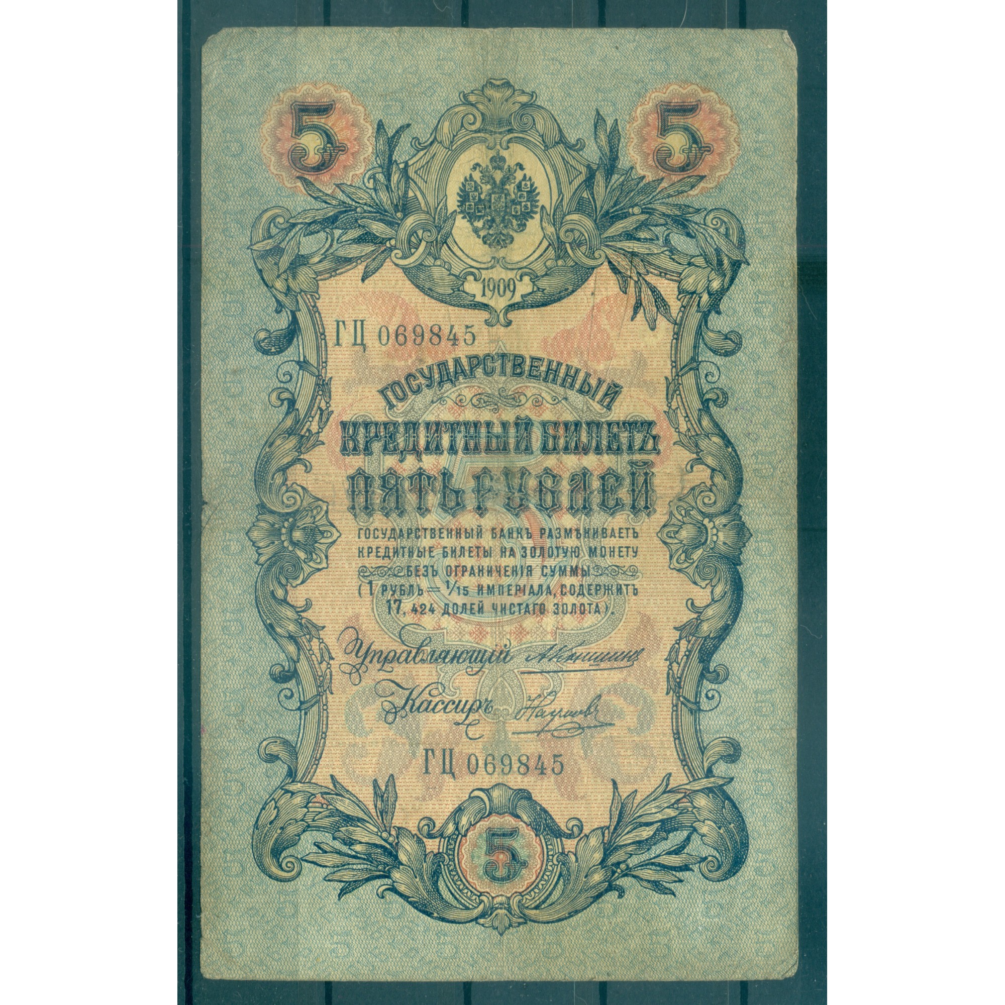 Impero Russo 1909 - Banconota della Banca di Stato dell'Impero Russo.