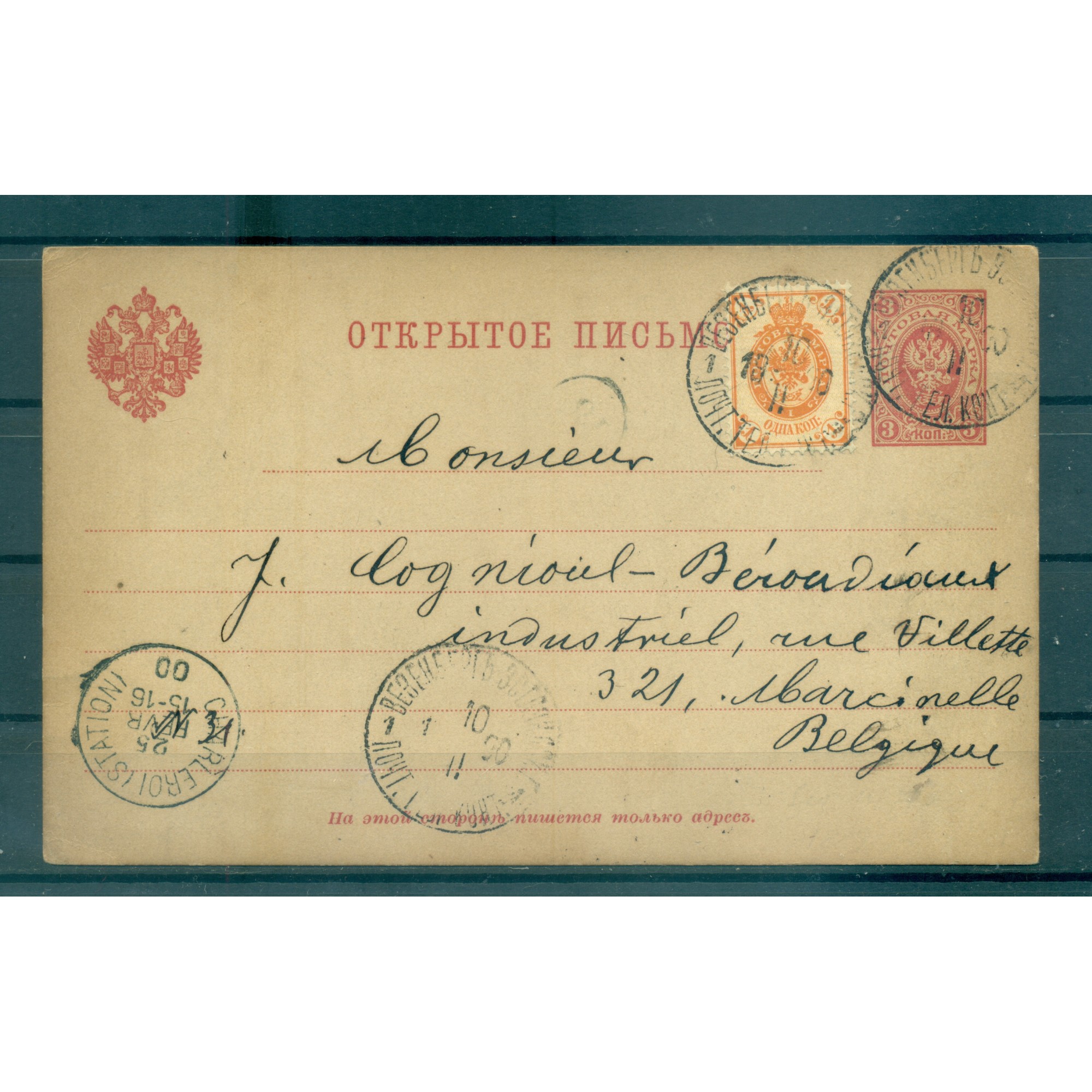 Intero postale datato 2 febbraio 1900 spedito da Wesenberg (Estonia) a Charleroi (Belgio).